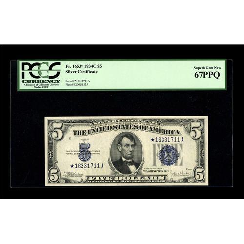 <B>Fr. 1653* $5 1934C Silver Certificate. PCGS Superb Gem New 67PPQ.</B></I><BR>This is the highest graded replacement for this series we have had the pleasure to auction. It is rarely seen in this state of preservation.<BR><I>From The Bill and Kathy Stella Currency Collection</B></I><BR><BR><b>Shipping:</b> Coin/Currency (<a target="_blank" href="http://www.heritageauctions.com/common/shipping.php">view shipping information</a>)