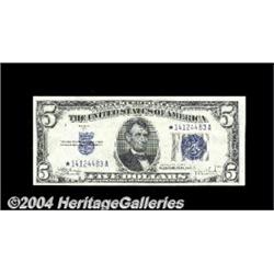 Fr. 1653* $5 1934C Silver Certificates. Two Consecutive Examples. Very Choice Crisp Uncirculated.A pair of consecutive examples, both nearly Gem but for trivial centering imperfections. 2 notes <BR><BR><B>Important notice:</B> Heritage usually auctions material at the rate of 200-250 lots per hour. On some occasions eBay Live bid software or the Internet may not be able to keep up with the pace of the auction. We recommend placing a realistic absentee bid now as insurance to avoid disappointment. Occasionally the auctioneer may eliminate or reject an eBay Live bid, and the auctioneer may also reopen a lot after the close of the eBay live bidding (usually because we missed an audience bid), and may reject your bid even if it shows you as the winning bidder. By bidding via eBay Live, you agree that Heritage may award the lot to another bidder at its sole discretion under the circumstances described above or any other reasonable circumstances. Since eBay bids are not shown to us until we open the lot on the floor, we treat those bids just like floor bids. In most cases the floor responds before the eBay bid is presented to us, due to Internet lag time, so for consistency we have made it a policy that floor bids are always considered first over tie eBay live bids. Also please note that all Heritage lots purchased through eBay Live carry a 20% Buyer's Premium. Please make sure you read the Terms and Conditions before you bid. <BR><BR><B>IMPORTANT ANNOUNCEMENT ABOUT RESERVES:</B> Heritage now divulges all reserves on its web site 7 days before every auction. If you want to know whether the reserve on this lot has been met, and if not, what the reserve amount is, please visit this lot page on the HeritageCoin.com web site, or email: bid@HeritageGalleries.com