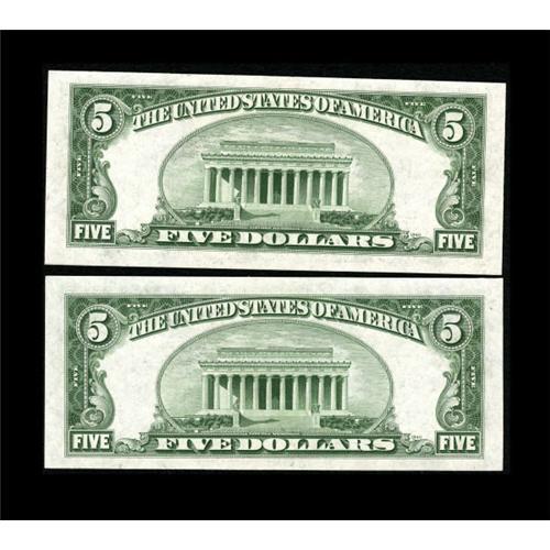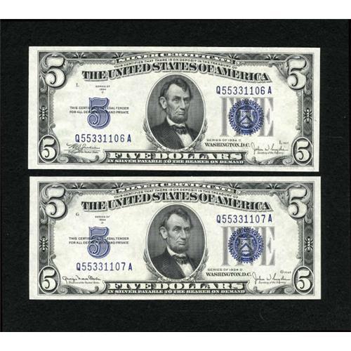 <B>Fr. 1653/Fr. 1654 $5 1934C/1934D Silver Certificates. Changeover Pair. Gem Crisp Uncirculated.</B></I><BR> The margins are just huge and the embossing very pronounced on this wonderful blue seal COP.<BR><BR><b>Shipping:</b> Coins & Currency (<a target="_blank" href="http://www.heritageauctions.com/common/shipping.php">view shipping information</a>)