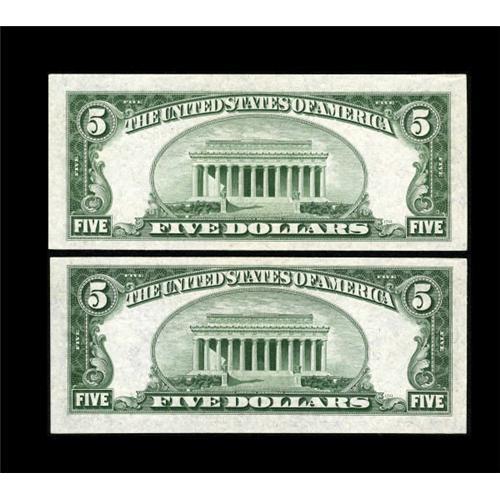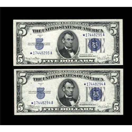 <B>Fr. 1653*/Fr. 1654* $5 1934C/1934D Silver Certificates. Changeover Pair. Very Choice Crisp Uncirculated.</B></I><BR> This is a scarce changeover pair with only four listed in the Schwartz/Lindquist guide. This makes the fifth and it is an evenly matched pair which only suffers from non-Gem centering.<BR><BR><b>Shipping:</b> Coins & Currency (<a target="_blank" href="http://www.heritageauctions.com/common/shipping.php">view shipping information</a>)