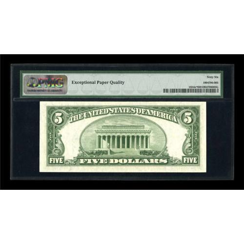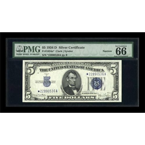 <B>Fr. 1654* $5 1934D Narrow Silver Certificate. PMG Gem Uncirculated 66 EPQ.</B></I><BR> Broad margins frame this popular and scarce star issue. Back plate number 2009 is noted.<BR><BR><b>Shipping:</b> Coins & Currency (<a target="_blank" href="http://www.heritageauctions.com/common/shipping.php">view shipping information</a>)