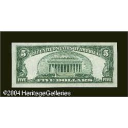 Fr. 1654* $5 1934D Silver Certificate. Choice About Unc <B>Fr. 1654* $5 1934D Silver Certificate. Gem Crisp Uncirculated.</B></I><BR>The Wide I variety. As attractive and pristine a note as one could hope to acquire. The paper surfaces are absolutely flawless, the embossing above even a hint of suspicion and the color beyond reproach. Although the centering is slightly off top to bottom, to classify this lovely note as anything less than a Gem would be an injustice. <BR><BR><B>Important notice:</B> Heritage usually auctions material at the rate of 200-250 lots per hour. On some occasions eBay Live bid software or the Internet may not be able to keep up with the pace of the auction. We recommend placing a realistic absentee bid now as insurance to avoid disappointment. Occasionally the auctioneer may eliminate or reject an eBay Live bid, and the auctioneer may also reopen a lot after the close of the eBay live bidding (usually because we missed an audience bid), and may reject your bid even if it shows you as the winning bidder. By bidding via eBay Live, you agree that Heritage may award the lot to another bidder at its sole discretion under the circumstances described above or any other reasonable circumstances. Since eBay bids are not shown to us until we open the lot on the floor, we treat those bids just like floor bids. In most cases the floor responds before the eBay bid is presented to us, due to Internet lag time, so for consistency we have made it a policy that floor bids are always considered first over tie eBay live bids. Also please note that all Heritage lots purchased through eBay Live carry a 20% Buyer's Premium. Please make sure you read the Terms and Conditions before you bid. This lot is being auctioned in conjunction with a live floor auction by Heritage Galleries & Auctioneers. All final auction and invoice information will be supplied by Heritage Galleries & Auctioneers, and all other information should be considered preliminary. Lot:16249