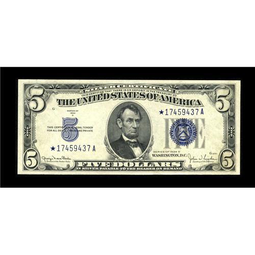 <B>Fr. 1654* $5 1934D Silver Certificate. Gem Crisp Uncirculated.</B></I><BR>Monstrous embossing is seen on this replacement note of the Wide I variety.<BR><BR><b>Shipping:</b> Coin/Currency (<a target="_blank" href="http://www.heritageauctions.com/common/shipping.php">view shipping information</a>)
