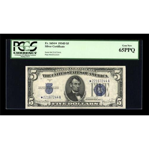 Fr. 1654* $5 1934D Silver Certificate. PCGS Gem