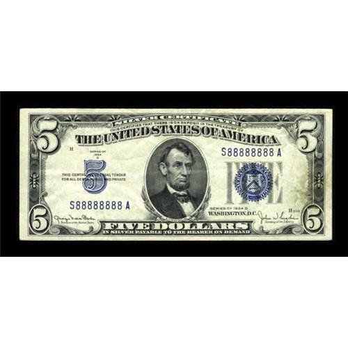 <B>Fr. 1654 $5 1934D Silver Certificate. Very Fine-Extremely Fine.</B></I><BR> A most unusual note which bears desirable solid serial number S88888888A. This is the only solid eight serial number $5 Silver Certificate we can recall handling, and it is one of only a literal handful of early solid serial number examples we've seen in this entire series. The note is bright, has nice eye appeal, and only light circulation. Any estimate here is somewhat of a guess, but the desirability of this example makes us believe that the hammer will fall somewhere in the range of...<BR><BR><b>Shipping:</b> Coins & Currency (<a target="_blank" href="http://www.heritageauctions.com/common/shipping.php">view shipping information</a>)