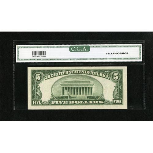 <B>Fr. 1654* $5 1934D Wide I Silver Certificate. CGA Gem Uncirculated 66.</B></I><BR>Bold ink colors and mountainous punch through embossing practically explode through the holder.<BR><BR><b>Shipping:</b> Coins & Currency (<a target="_blank" href="http://www.heritageauctions.com/common/shipping.php">view shipping information</a>)