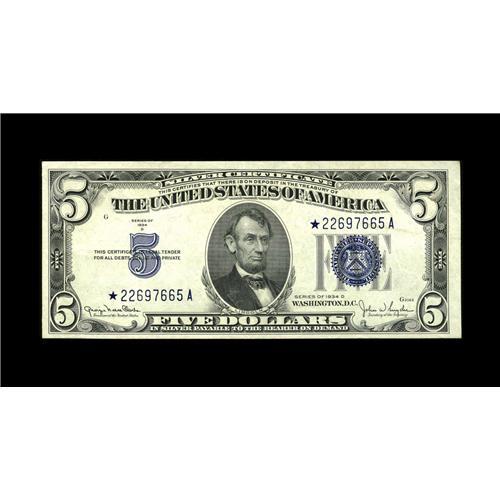 <B>Fr. 1654* $5 1934D Wide II Silver Certificate. About Uncirculated.</B></I><BR>Original surfaces and embossing are paired with this interesting variety.<BR><I>From The Bill and Kathy Stella Currency Collection</B></I><BR><BR><b>Shipping:</b> Coin/Currency (<a target="_blank" href="http://www.heritageauctions.com/common/shipping.php">view shipping information</a>)