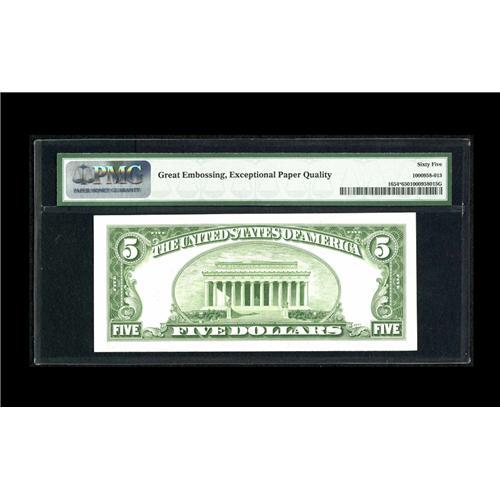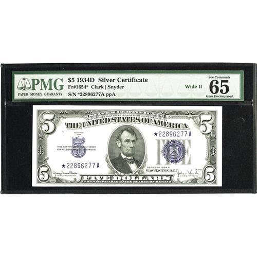<B>Fr. 1654* $5 1934D Wide II Silver Certificate. PMG Gem Uncirculated 65 EPQ.</B></I><BR>This tougher replacement note carries Back Plate 2077. Very bright with excellent embossing seen through the holder.