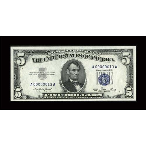 <B>Fr. 1655 $5 1953 Silver Certificate. Low Serial Number 13. Gem Crisp Uncirculated.</B></I><BR> This note comes from the first sheet of notes printed. Well margined with a narrower margin seen along the bottom. <BR><BR><b>Shipping:</b> Coins & Currency (<a target="_blank" href="http://www.heritageauctions.com/common/shipping.php">view shipping information</a>)