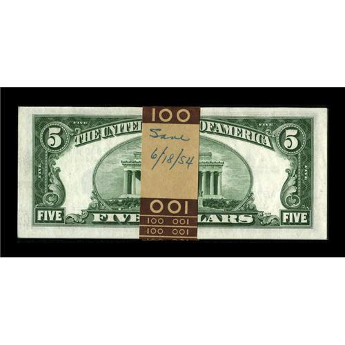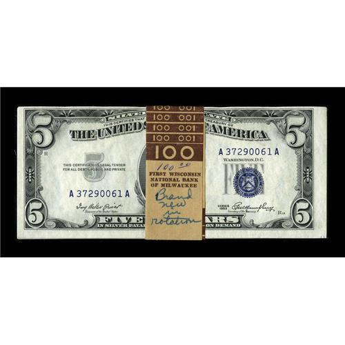 <B>Fr. 1655 $5 1953 Silver Certificates. Twenty Consecutive Examples. Choice Crisp Uncirculated.</B></I><BR>This partial pack of notes was plucked from the First Wisconsin National Bank of Milwaukee on 6/18/54 and has finally been found over 50 years later. Uncompromised, original surfaces are seen throughout the run.<BR><BR><b>Shipping:</b> Coins & Currency (<a target="_blank" href="http://www.heritageauctions.com/common/shipping.php">view shipping information</a>)