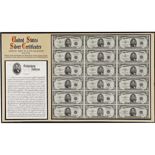 <B>Fr. 1655 $5 1953 Silver Certificates. Uncut Sheet of 18. Choice Crisp Uncirculated.</B></I><BR>This exceptionally attractive sheet would clearly be a full Gem but for the presence of a few scattered handling wrinkles, all of which are so trivial and unimportant that they are hardly worth mentioning. This ex-Irving Moskovitz Collection piece was sold as Lot 1630 of the dispersal of that fabled holding by Bowers and Ruddy in 1977 and bears the original lot tag as documentation of its pedigree. It is attractively matted next to an inscribed copy of Lincoln's Gettysburg Address with hand lettering and illumination above. The upper left note of the sheet bears serial A00000052A and the serials advance by 8000 per note vertically down the columns. The lower right note bears the autographs of Treasurer of the United States Ivy Baker Priest and Secretary of the Treasury George Humphrey, both of whose engraved signatures adorn this lovely sheet. While the Priest autograph is fresh and vivid, the Humphrey autograph has faded almost entirely. Given the growing popularity of Treasury official autographed currency, the allure of items pedigreed to major collections, the attractive display and the overall superior aesthetics of this appealing item, it is likely that bidding will reach no less than...<BR><I>From The Rolling Plains Collection</B></I><BR><BR><b>Shipping:</b> Coins & Currency (<a target="_blank" href="http://www.heritageauctions.com/common/shipping.php">view shipping information</a>)