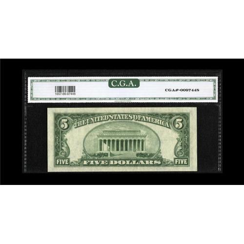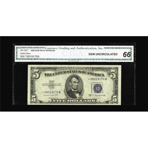 <B>Fr. 1657* $5 1953B Silver Certificate. CGA Gem Uncirculated 66.</B></I><BR>An extremely rare note in this grade, with this arguably one of the finest examples of this key to the series we've ever had the pleasure of offering. The last time a high grade specimen from this series was sold was in our Taylor Family Collection sale where it realized $14,950 on an estimate of $6000 - $9000. This note definitely has better margins than the Taylor note with great centering on the back.