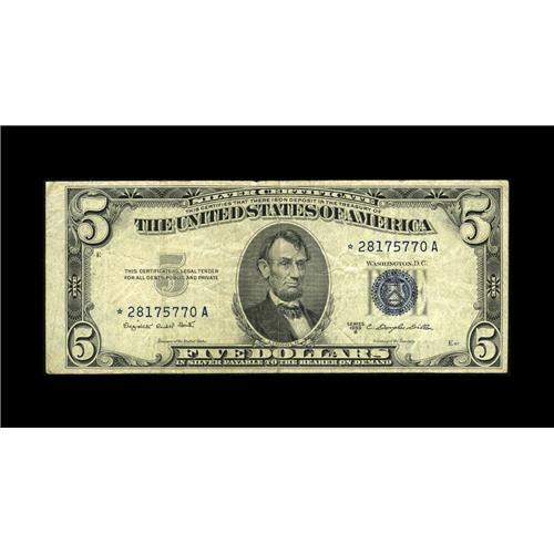 <B>Fr. 1657* $5 1953B Silver Certificate. Fine.</B></I><BR>This has proved to be one of the most difficult to obtain small size stars. A few of these stars escaped into circulation in the early 1960s when this series was first issued. The collectors of the day were confident that many 1953B stars would be eventually released and therefore they passed on the "high" prices being asked for the notes. Nevertheless this large release never materialized due to the discontinuance of Silver Certificates. The collectors had outsmarted themselves and the rarity of this note was finally realized. This is a nice example for the grade that exhibits even wear and a small spot of red ink is also found in the back bottom margin.<BR><I>From The Bill and Kathy Stella Currency Collection</B></I><BR><BR><b>Shipping:</b> Coin/Currency (<a target="_blank" href="http://www.heritageauctions.com/common/shipping.php">view shipping information</a>)