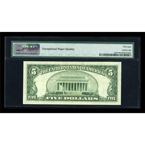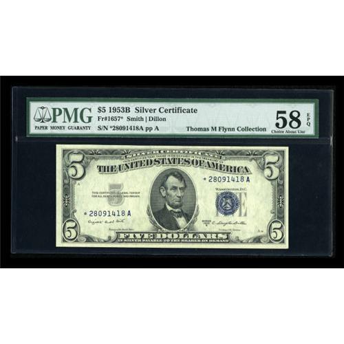 <B>Fr. 1657* $5 1953B Silver Certificate. PMG Choice About Unc 58 EPQ.</B></I><BR> This is a beautiful example of this latter day rarity, bright, fresh, and utterly original. We examined this note out of the holder before it was sent to the grading service and both your cataloguer and one other grader independently arrived at a Choice 64 EPQ designation for this piece. While there was some handling evident, it seemed to us nothing out of the ordinary for a note with exceptional paper quality. This is a very rare note in all grades, and especially so this nice, but it seems unfortunate that such an attractive example out of the holder is now locked up in a Choice About Uncirculated 58 encasement, even if it does bear the EPQ label. <BR><I>From The Thomas M. Flynn Collection</B></I><BR><BR><b>Shipping:</b> Coins & Currency (<a target="_blank" href="http://www.heritageauctions.com/common/shipping.php">view shipping information</a>)
