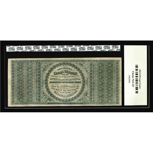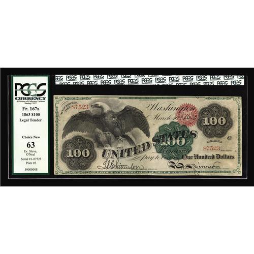 <B>Fr. 167a $100 1863 Legal Tender PCGS Choice New 63.</B></I> When we sold this note as part of Jim O'Neal's magnificent Type collection, we used the following description. "When last on the auction block in 2000, this stately Spread Eagle $100 realized $88,000. A few years prior to that, we had the pleasure of handling this piece and at that time described it, 'This flawless Spread Eagle note traces its history to a Lyn Knight 1977 fixed price list. It then appeared in a Stack's 1989 auction, CAA's first sale in November of 1990, and the Andrew Shiva Sale in May of 1995. Seven uncirculated Spread Eagles are known for all six Friedberg numbers in total. Of these, one is in a museum and three have been off the market for several decades. This is one of only two uncirculated Spread Eagles that have reached the auction market since 1947. It's fully Choice, with exceptional color and clarity of printing. The centering is outstanding for the issue, with all the margins clear of the design; in fact, were the centering just a bit better, this note would be fully Gem. It's also blessedly free of the usual edge problems and subsequent repairs that plague this thin-paper issue. This beautiful design is the classic of our early Federal notes, and it is missing in high grade from most major collections. We are very pleased to have the opportunity to offer this lovely note to a cadre of collectors who have never had the opportunity to purchase its equal.' Census figures have changed only slightly since that time, and opportunities to purchase Choice Uncirculated Spread Eagles are counted in groups of years rather than months." Since the O'Neal sale, the current owner submitted the note to PCGS, and they agree with our grading. In the O'Neal sale, the note realized $115,000. The market has changed considerably over the past year and none of the new high-level entrants has yet had the opportunity to purchase a Choice Spread Eagle $100 - making estimating this piece problematic at best. Ever equal to a challenge, we will try...
