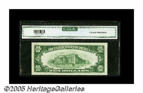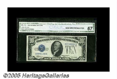 <B>Fr. 1700 $10 1933 Silver Certificate. CGA Gem Uncirculated 67.</B></I><BR>A lovely example of one of the most sought after twentieth century rarities, the 1933 $10 Silver Certificate. This example is far better centered than most, and bears fancy low serial number A00000088A as a bonus. It has been slabbed by CGA, and is the highest grade third-party-certified example of this rarity we've seen or handled.