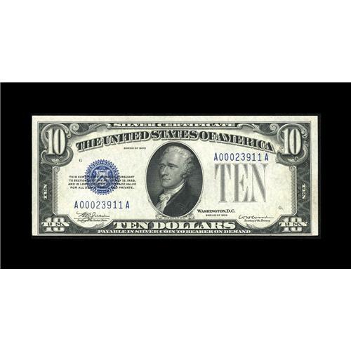 <B>Fr. 1700 $10 1933 Silver Certificate. Choice Crisp Uncirculated.</B></I><BR>A rare and in demand note in every grade, with the supply clearly inadequate to cover the demand for this much sought after one year type. The supply of these notes has all but dried up in recent years, and it isn't often that collectors have the opportunity to obtain an Uncirculated example. The bottom margin is very tight, but at no point does it touch the design of the note, and in all other respects this example is gem...but without the gem price tag.