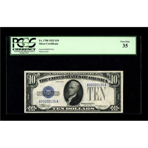 <B>Fr. 1700 $10 1933 Silver Certificate. PCGS Very Fine 35.</B></I><BR>This "King of Silvers" note is especially bright with behemoth margins and decent centering. The grade will allow a lucky collector to finally secure an example. Expect this classic to hammer in the range of...<BR><I>From The Bill and Kathy Stella Currency Collection</B></I><BR><BR><b>Shipping:</b> Coin/Currency (<a target="_blank" href="http://www.heritageauctions.com/common/shipping.php">view shipping information</a>)