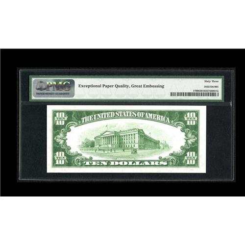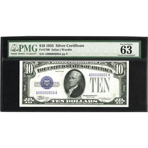 <B>Fr. 1700 $10 1933 Silver Certificate. PMG Choice Uncirculated 63 EPQ.</B></I><BR>This lovely example of the key piece to the Silver Certificate series bears the coveted EPQ designation bestowed by PMG, as well as fancy serial number A00000666A. Also, noted on the holder is the statement "Great Embossing." Expect a realization somewhere in the range of...