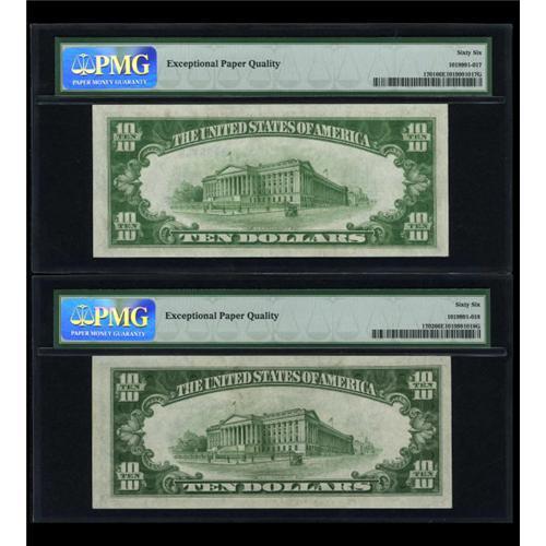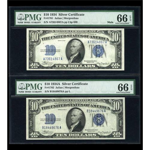 <B>Fr. 1701 $10 1934 Mule Silver Certificate. PMG Gem Uncirculated 66 EPQ.</B></I><BR> Embossing and natural paper surfaces are viewed through the third-party holder. Prices accelerate greatly beyond the 65 grade barrier.<BR><BR><b>Shipping:</b> Coins & Currency (<a target="_blank" href="http://www.heritageauctions.com/common/shipping.php">view shipping information</a>)