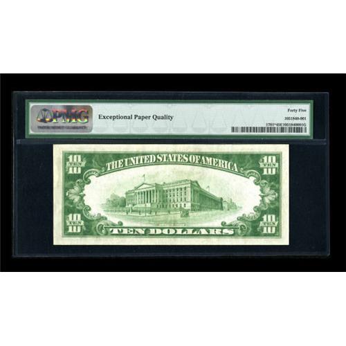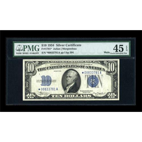 <B>Fr. 1701* $10 1934 Mule Silver Certificate. PMG Choice Extremely Fine 45 EPQ.</B></I><BR> A very scarce note in this grade, with this piece displaying only the lightest traces of circulation. The originality here is evident, garnering this Mule star the coveted EPQ designation from PMG.<BR><BR><b>Shipping:</b> Coins & Currency (<a target="_blank" href="http://www.heritageauctions.com/common/shipping.php">view shipping information</a>)