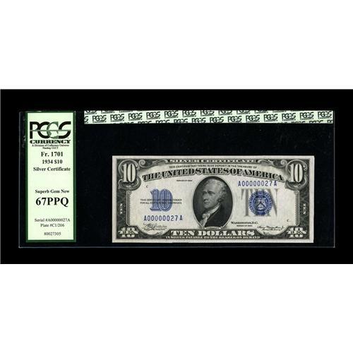 <B>Fr. 1701 $10 1934 Silver Certificate. PCGS Superb Gem New 67PPQ.</B></I><BR>Hulking margins, perfect centering and punch through embossing all lend credence to this lofty grade. One must have the patience of Job before embarking on the pursuit of an early Silver ten of this quality coupled with the scarcity of low serial number A00000027A.<BR><BR><b>Shipping:</b> Coin/Currency (<a target="_blank" href="http://www.heritageauctions.com/common/shipping.php">view shipping information</a>)