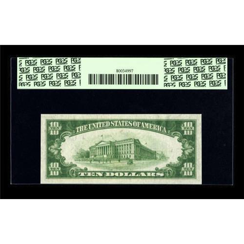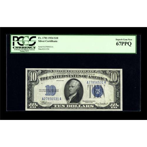 <B>Fr. 1701 $10 1934 Silver Certificate. PCGS Superb Gem New 67PPQ.</B></I><BR> A pleasing Superb note, with a deep blue overprint and bright white paper.<BR><BR><b>Shipping:</b> Coins & Currency (<a target="_blank" href="http://www.heritageauctions.com/common/shipping.php">view shipping information</a>)
