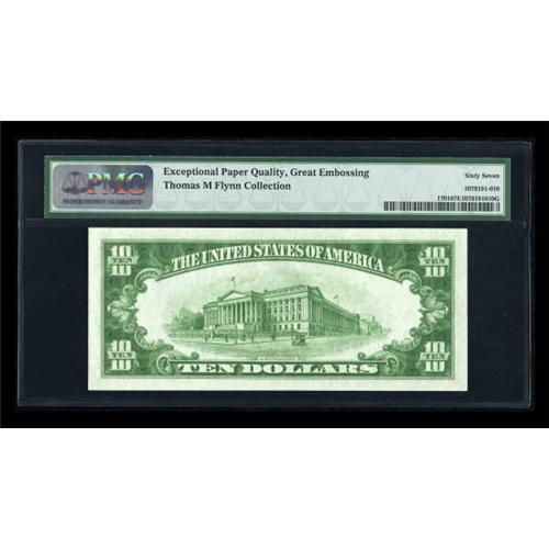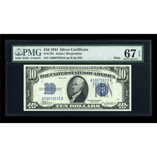 <B>Fr. 1701 $10 1934 Mule Silver Certificate. PMG Superb Gem Unc 67 EPQ.</B></I><BR> PMG has graded 181 1934 $10 Silvers, both mule and non-mule to date. Of that number, three have been assigned the Superb Gem 67 grade. Need we say more?<BR><I>From The Thomas M. Flynn Collection</B></I><BR><BR><b>Shipping:</b> Coins & Currency (<a target="_blank" href="http://www.heritageauctions.com/common/shipping.php">view shipping information</a>)