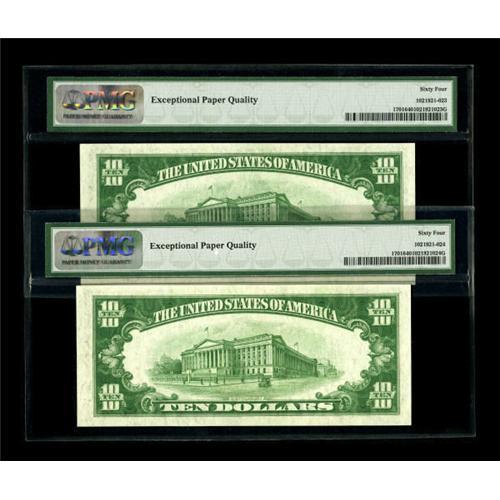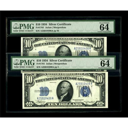 <B>Fr. 1701 $10 1934 Silver Certificates. Two Consecutive Examples. PMG Choice Uncirculated 64 EPQ</B></I>.<B></B></I><BR> This pair is sure to please with all natural paper qualities.<BR><BR><b>Shipping:</b> Coins & Currency (<a target="_blank" href="http://www.heritageauctions.com/common/shipping.php">view shipping information</a>)