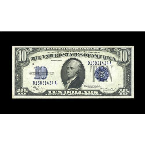 <B>Fr. 1702 $10 1934A Silver Certificate. Face Plate 86 Choice Crisp Uncirculated.</B></I><BR>No problems are noticed on this face plate 86 example that should please any collector who is looking for this specialized and highly collectible variety. Nicely margined and bright, the colors are deep.<BR><BR><b>Shipping:</b> Coin/Currency (<a target="_blank" href="http://www.heritageauctions.com/common/shipping.php">view shipping information</a>)