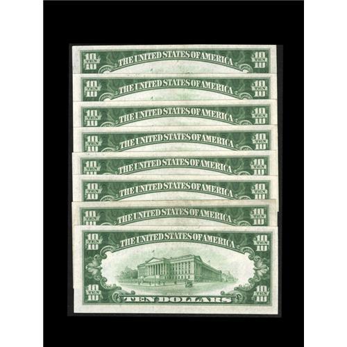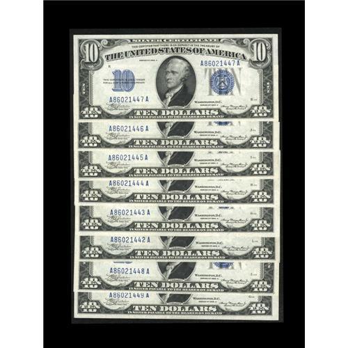 <B>Fr. 1702 $10 1934A Silver Certificates. Eight Consecutive Examples.</B></I><BR>Embossing is noticed on this grouping that has five notes grading <B>Choice CU,</B></I> while three notes grade <B>Choice AU.</B></I>