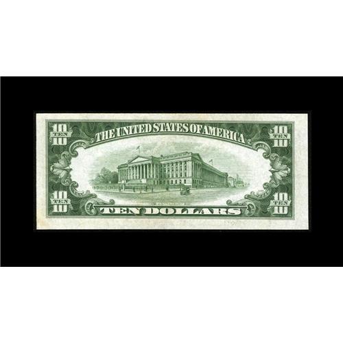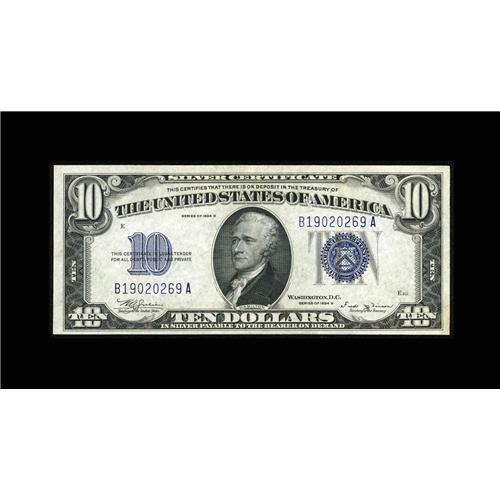<B>Fr. 1703 $10 1934B Silver Certificate. Choice About Uncirculated.</B></I><BR>A common enough note in all grades through Very Fine, but a truly scarce item once the higher grade levels are reached. But for a well hidden corner fold this note is New.