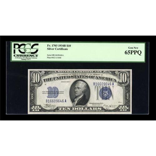 <B>Fr. 1703 $10 1934B Silver Certificate. PCGS Gem New 65PPQ.</B></I><BR> This is one of the nicest $10 1934B's we have ever seen. That is as true now as when we first offered this note in our September 1996 auction. The note's current owner wisely chose quality back then. Now a new collector gets to appreciate the quality of this note. Embossing and natural paper wave are just two of the worthy merits of this beauty.<BR><I>From The Drew Keough Collection</B></I><BR><BR><b>Shipping:</b> Coins & Currency (<a target="_blank" href="http://www.heritageauctions.com/common/shipping.php">view shipping information</a>)