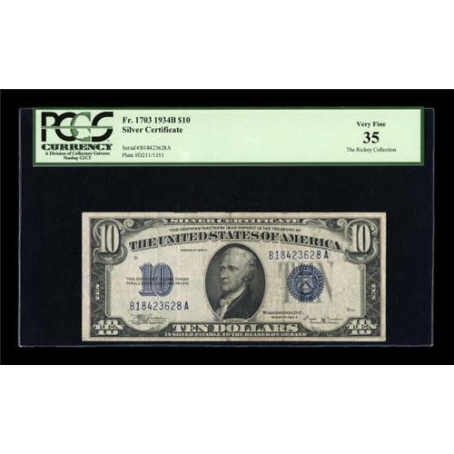 <B>Fr. 1703 $10 1934B Silver Certificate. PCGS Very Fine 35.</B></I><BR> This is a pleasing mid-grade example of this tougher series for the issue.<BR><BR><b>Shipping:</b> Coins & Currency (<a target="_blank" href="http://www.heritageauctions.com/common/shipping.php">view shipping information</a>)