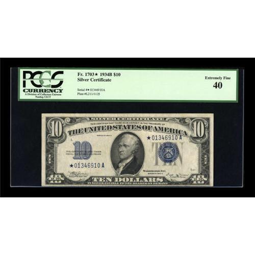 <B>Fr. 1703* $10 1934B Silver Certificate. PMG Extremely Fine 40.</B></I><BR> This is an excessively rare star note that we originally sold in our May 1997 auction. These are nearly impossible to find in XF or better condition. In the last twelve years we have had only six examples of this rare star to offer, three lower grade pieces, one slightly better piece, and one uncirculated example, which we sold in the Taylor Family collection in February 2005 for $25,300. With those two exceptions, this specimen is the nicest we have encountered in over a decade. This is a lightly handled example and sure to please the collector not wishing to spend a small fortune for this rare star. <BR><I>From The Drew Keough Collection</B></I><BR><BR><b>Shipping:</b> Coins & Currency (<a target="_blank" href="http://www.heritageauctions.com/common/shipping.php">view shipping information</a>)