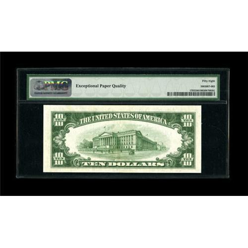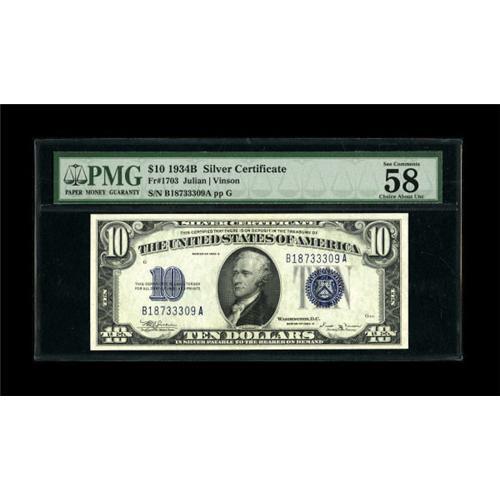 <B>Fr. 1703 $10 1934B Silver Certificate. PMG Choice About Unc 58 EPQ.</B></I><BR> A center fold is noticed on this bright, well inked example from the toughest regular issue for the type.<BR><BR><b>Shipping:</b> Coins & Currency (<a target="_blank" href="http://www.heritageauctions.com/common/shipping.php">view shipping information</a>)
