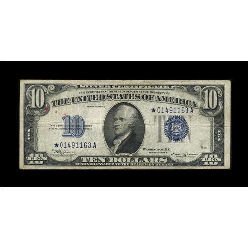 <B>Fr. 1703* $10 1934B Silver Certificate. Very Fine.</B></I><BR>This is a picture-perfect VF example of this extremely rare star note. The overprint is especially bold for the grade. We would be interested in seeing a census of examples known as the number is certainly paltry. The last few editions of the Oakes opus has listed this issue in VF at $2,500. There is no reason why it isn't worth at least that. A touch of ink is noted on one end.<BR><I>From The Bill and Kathy Stella Currency Collection</B></I><BR><BR><b>Shipping:</b> Coin/Currency (<a target="_blank" href="http://www.heritageauctions.com/common/shipping.php">view shipping information</a>)