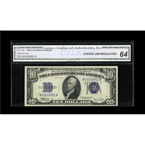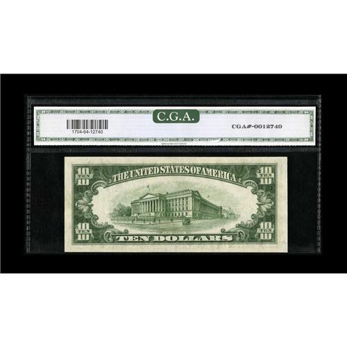 <B>Fr. 1704 $10 1934C Silver Certificate. CGA Choice Uncirculated 64.</B></I><BR>This bright example has a nicely centered back.