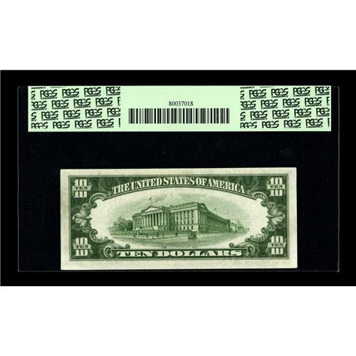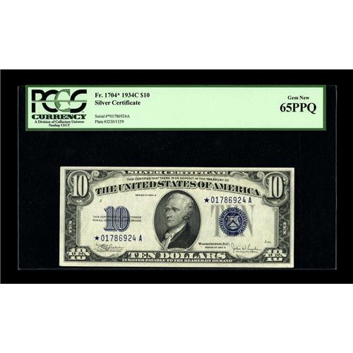 <B>Fr. 1704* $10 1934C Silver Certificate. PCGS Gem New 65PPQ.</B></I><BR>This most pleasing Gem has embossing of the seal and serial numbers that is clearly visible on back, even through the third party holder. The paper quality is original and complementary.<BR><I>From The Bill and Kathy Stella Currency Collection</B></I><BR><BR><b>Shipping:</b> Coin/Currency (<a target="_blank" href="http://www.heritageauctions.com/common/shipping.php">view shipping information</a>)