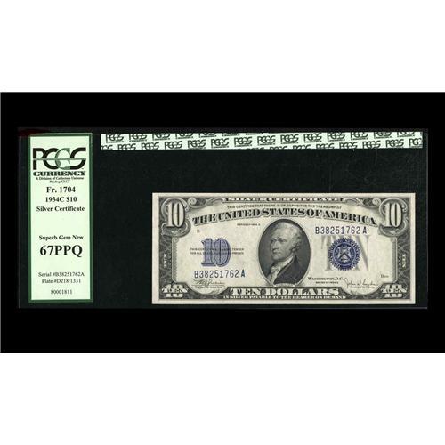 <B>Fr. 1704 $10 1934C Silver Certificate. PCGS Superb Gem New 67 PPQ.</B></I><BR>A lovely example given the unusually high grade of Superb Gem New 67 PPQ by PCGS.