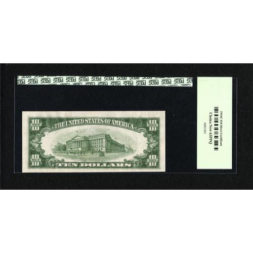 <B>Fr. 1704 $10 1934C Silver Certificate. PCGS Choice New 63PPQ.</B></I><BR> A bit thin along the bottom though this bright note is original in every way.<BR><BR><b>Shipping:</b> Coins & Currency (<a target="_blank" href="http://www.heritageauctions.com/common/shipping.php">view shipping information</a>)