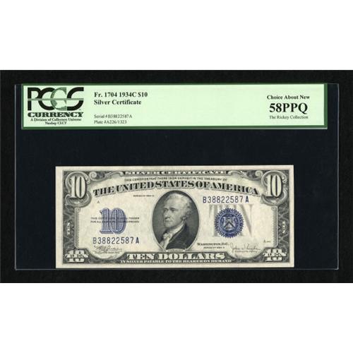 <B>Fr. 1704 $10 1934C Silver Certificate. PCGS Choice About New 58PPQ.</B></I><BR> A near consecutive example to the other 58PPQ in this auction.<BR><BR><b>Shipping:</b> Coins & Currency (<a target="_blank" href="http://www.heritageauctions.com/common/shipping.php">view shipping information</a>)