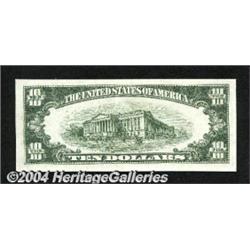 Fr. 1704* $10 1934C Silver Certificate. Choice-Gem Crisp Uncirculated.Acute corners and serial number embossing adorn this replacement that has a trivial paper inclusion. Gem but for the centering, which is just a hair off of perfect. <BR><BR><B>Important notice:</B> Heritage usually auctions material at the rate of 200-250 lots per hour. On some occasions eBay Live bid software or the Internet may not be able to keep up with the pace of the auction. We recommend placing a realistic absentee bid now as insurance to avoid disappointment. Occasionally the auctioneer may eliminate or reject an eBay Live bid, and the auctioneer may also reopen a lot after the close of the eBay live bidding (usually because we missed an audience bid), and may reject your bid even if it shows you as the winning bidder. By bidding via eBay Live, you agree that Heritage may award the lot to another bidder at its sole discretion under the circumstances described above or any other reasonable circumstances. Since eBay bids are not shown to us until we open the lot on the floor, we treat those bids just like floor bids. In most cases the floor responds before the eBay bid is presented to us, due to Internet lag time, so for consistency we have made it a policy that floor bids are always considered first over tie eBay live bids. Also please note that all Heritage lots purchased through eBay Live carry a 20% Buyer's Premium. Please make sure you read the Terms and Conditions before you bid. <BR><BR><B>IMPORTANT ANNOUNCEMENT ABOUT RESERVES:</B> Heritage now divulges all reserves on its web site 7 days before every auction. If you want to know whether the reserve on this lot has been met, and if not, what the reserve amount is, please visit this lot page on the HeritageCoin.com web site, or email: bid@HeritageGalleries.com