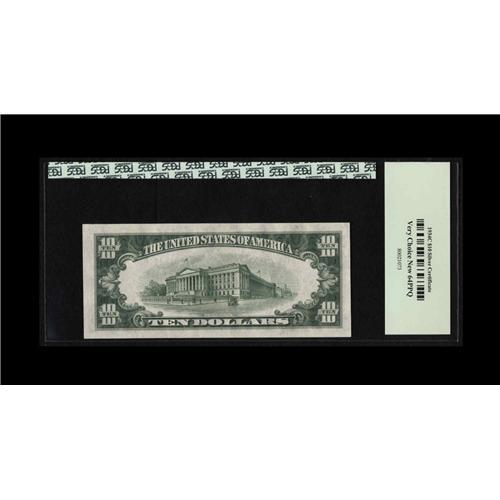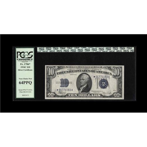 <B>Fr. 1704* $10 1934C Silver Star Certificate. PCGS Very Choice New 64PPQ.</B></I><BR>This Blue Seal replacement Sawbuck maintains excellent punch thru embossing on bright white surfaces with vibrant overprints.