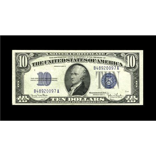 <B>Fr. 1705 $10 1934D Narrow Silver Certificate. About Uncirculated.</B></I><BR>Original surfaces are easily viewed on this $10 Silver.<BR><I>From The Bill and Kathy Stella Currency Collection</B></I><BR><BR><b>Shipping:</b> Coin/Currency (<a target="_blank" href="http://www.heritageauctions.com/common/shipping.php">view shipping information</a>)
