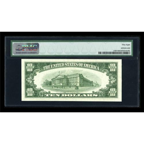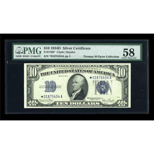 <B>Fr. 1705* $10 1934D Silver Certificate. PMG Choice About Unc 58.</B></I><BR> The 1934D Wide star is a tougher star in any grade above Extremely Fine. This Choice AU offers plenty of value for what will likely be a substantial discount from the uncirculated price of $4500 or so. <BR><I>From The Thomas M. Flynn Collection</B></I><BR><BR><b>Shipping:</b> Coins & Currency (<a target="_blank" href="http://www.heritageauctions.com/common/shipping.php">view shipping information</a>)