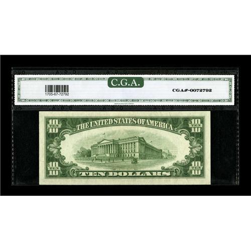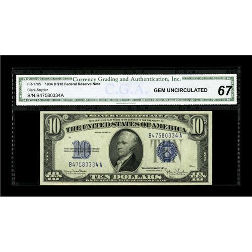 <B>Fr. 1705 $10 1934D Wide Silver Certificate. CGA Gem Uncirculated 67.</B></I><BR>Boardwalk margins and punch through embossing are both clearly visible through the third party holder.<BR><BR><b>Shipping:</b> Coin/Currency (<a target="_blank" href="http://www.heritageauctions.com/common/shipping.php">view shipping information</a>)