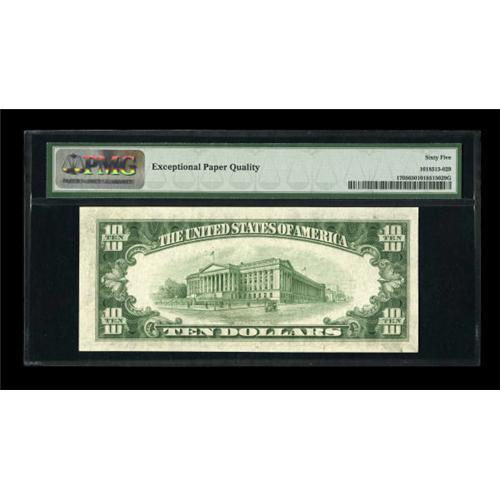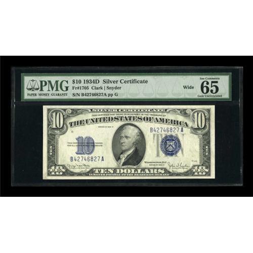 <B>Fr. 1705 $10 1934D Wide Silver Certificate. PMG Gem Uncirculated 65 EPQ.</B></I><BR> Plenty of punch thru embossing is apparent along with a vivid overprint.<BR><BR><b>Shipping:</b> Coins & Currency (<a target="_blank" href="http://www.heritageauctions.com/common/shipping.php">view shipping information</a>)