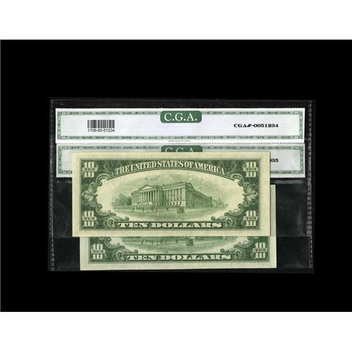 <B>Fr. 1706 $10 1953 Silver Certificate. CGA Gem Uncirculated 65.</B></I><BR><B>Fr. 1708 $10 1953B $10 Silver Certificate. CGA Gem Uncirculated 65.</B></I><BR>These always popular blue seals are bright and well embossed.
