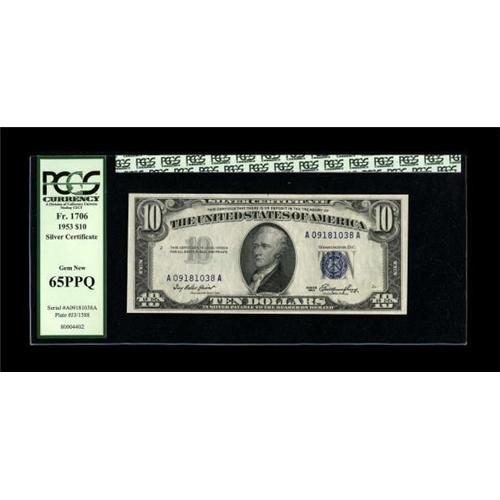 <B>Fr. 1706 $10 1953 Silver Certificate. PCGS Gem New 65PPQ.</B></I><BR> A well margined Gem with deep embossing.<BR><BR><b>Shipping:</b> Coins & Currency (<a target="_blank" href="http://www.heritageauctions.com/common/shipping.php">view shipping information</a>)